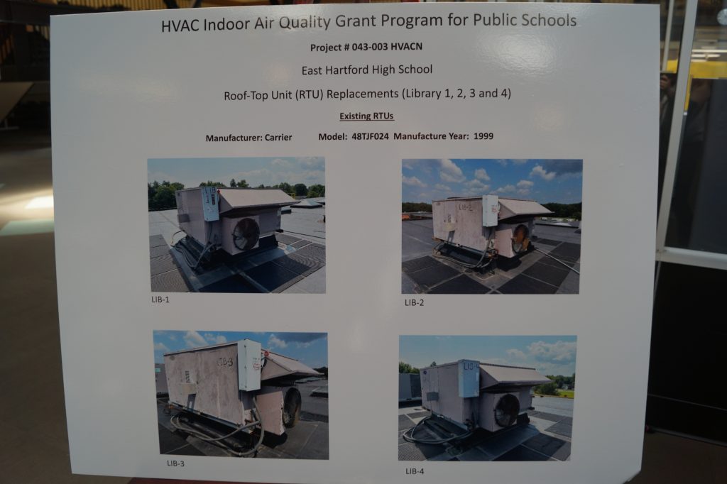 A board in the East Hartford High School library shows the four units the school is able to replace thanks to state HVAC grant funds.