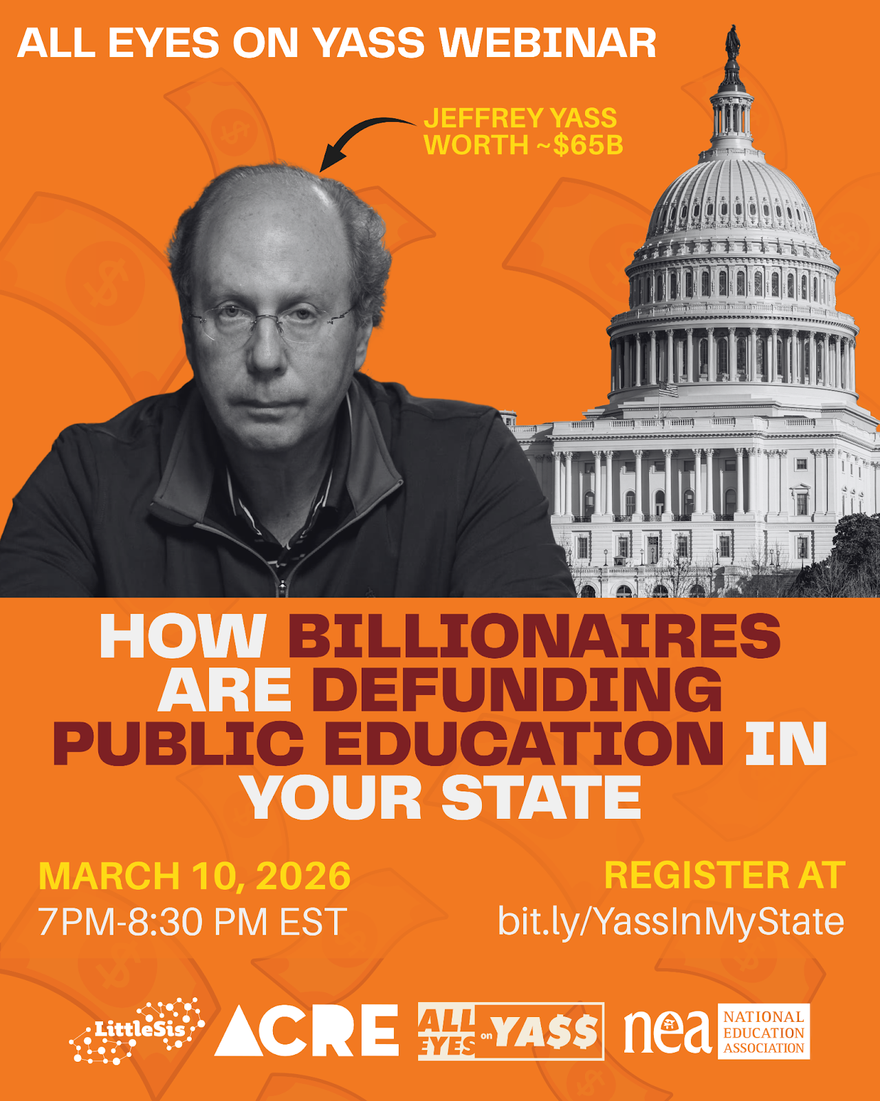 Join the All Eyes on Yass webinar on Tuesday, March 10 at 7PM ET/6PM CT/4PM PT. Because taking on billionaire-funded school privatization impacts elections, policy, organizing and communications, we encourage states to register in cross-department teams.