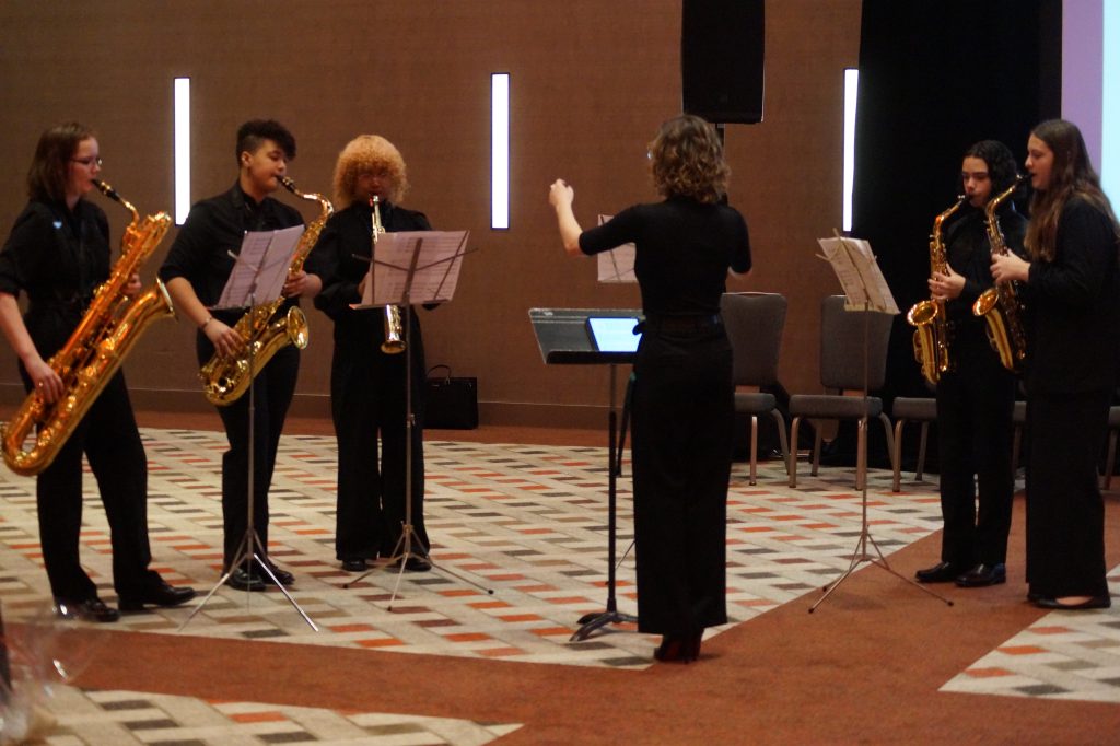 Delegates enjoyed a musical break mid-morning provided by saxophonists from New London High School’s band and their director Riley George before moving on to new business items.