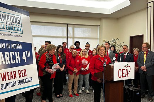 Teachers, parents, and community members across Connecticut wore Red for Ed yesterday during the Champions for Public Education Day of Action, and many elected officials joined them—drawing attention to the resources and funding schools need to support students.