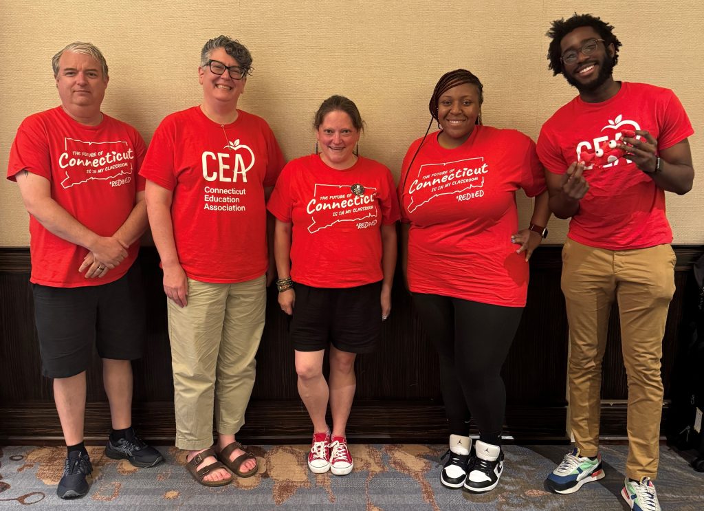 Bridgeport Education Association President Jeff Morrissey, CEA UniServ Rep Bekah Saxon, BEA members Katie Smuckler and Mikeya Stovall, and CEA Associate for Instructional and Professional Engagement Abdul Osmanu worked on an organizing plan around Board of Education elections.