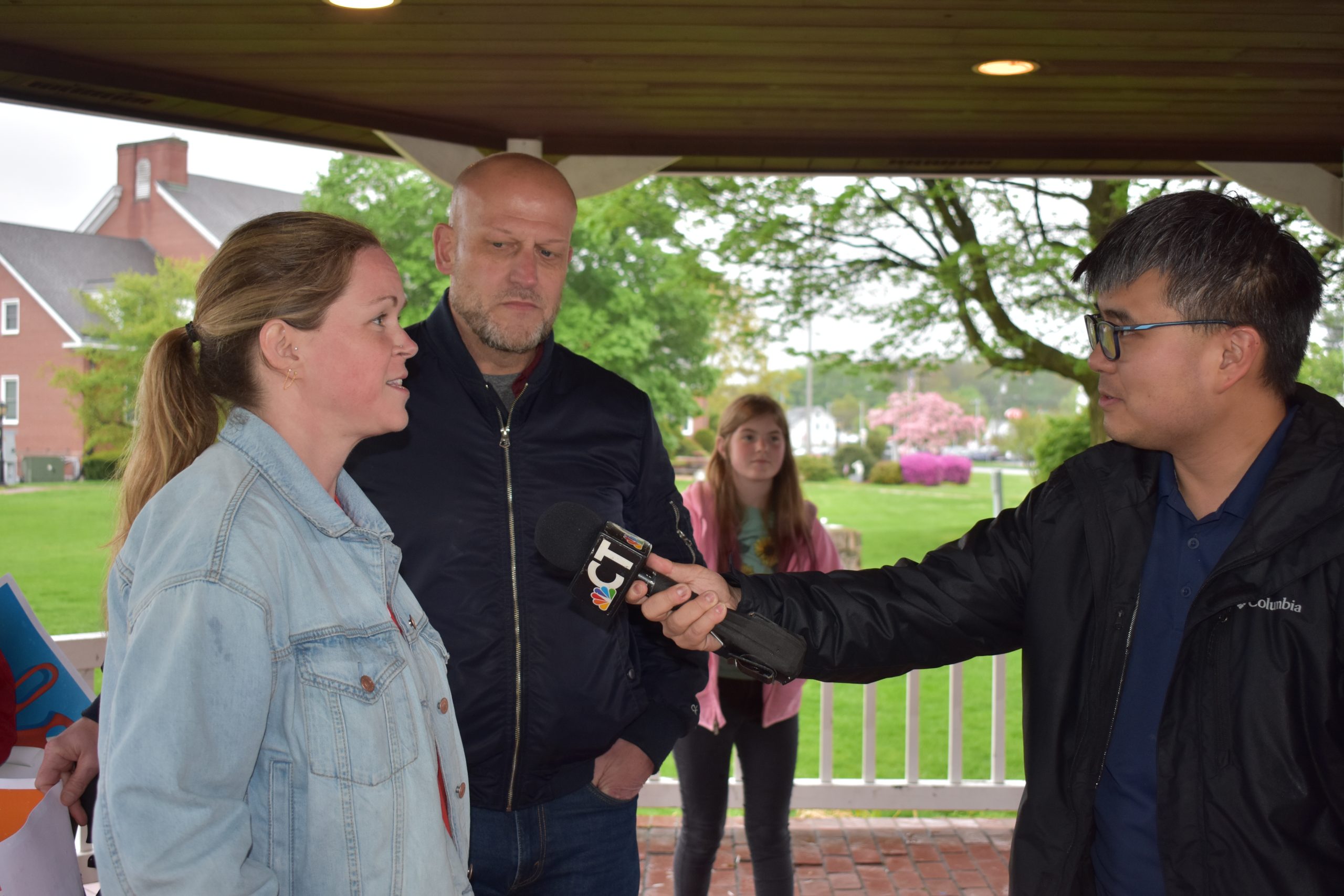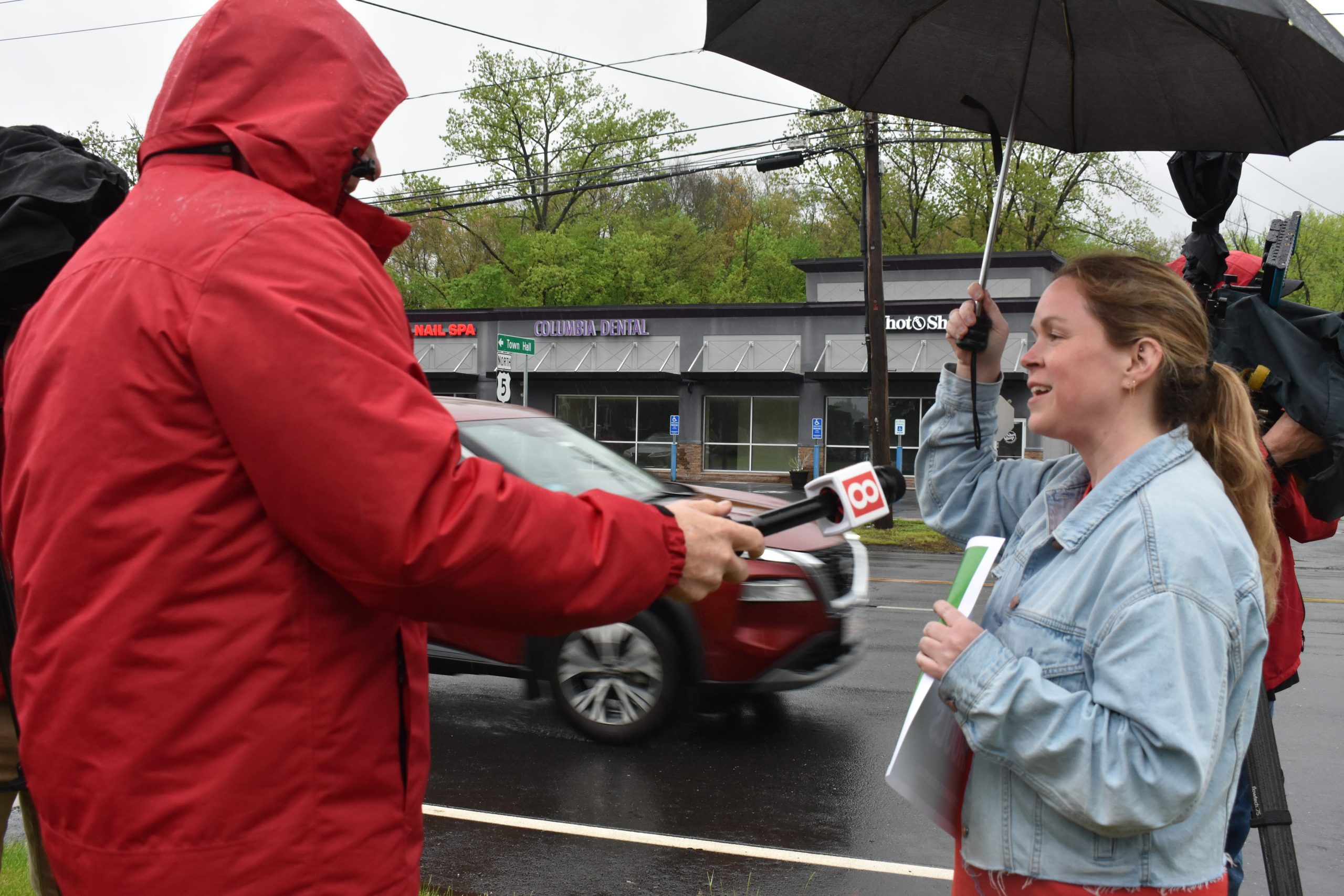 “We’re here with a clear and urgent purpose: to call on our Town Council to pass the full 5.57% budget increase called for by our board of education,” said ETA Political Action Chair Kelsey McGuire Bruce, addressing a crowd of supporters and reporters gathered under umbrellas and tents against the rain. “We know times are tough,” she acknowledged. “Families are making sacrifices, and the town is facing hard decisions. Coming off a year where we’re down 120 educators, our students have felt the absence every single day. Our classrooms are stretched, our programs are strained, and our students are feeling the impact. Today we raise our voices not just in concern, but in hope, sending the message to fund our schools and fund our future.”