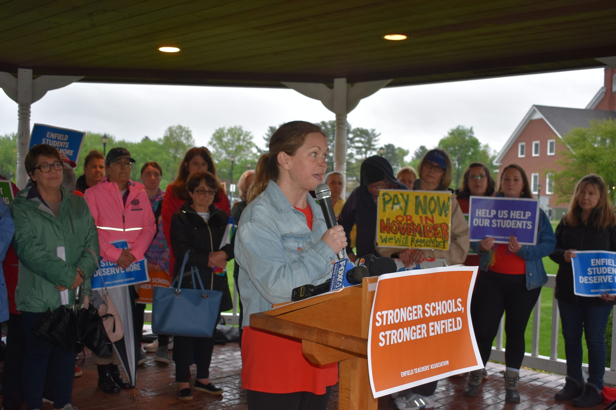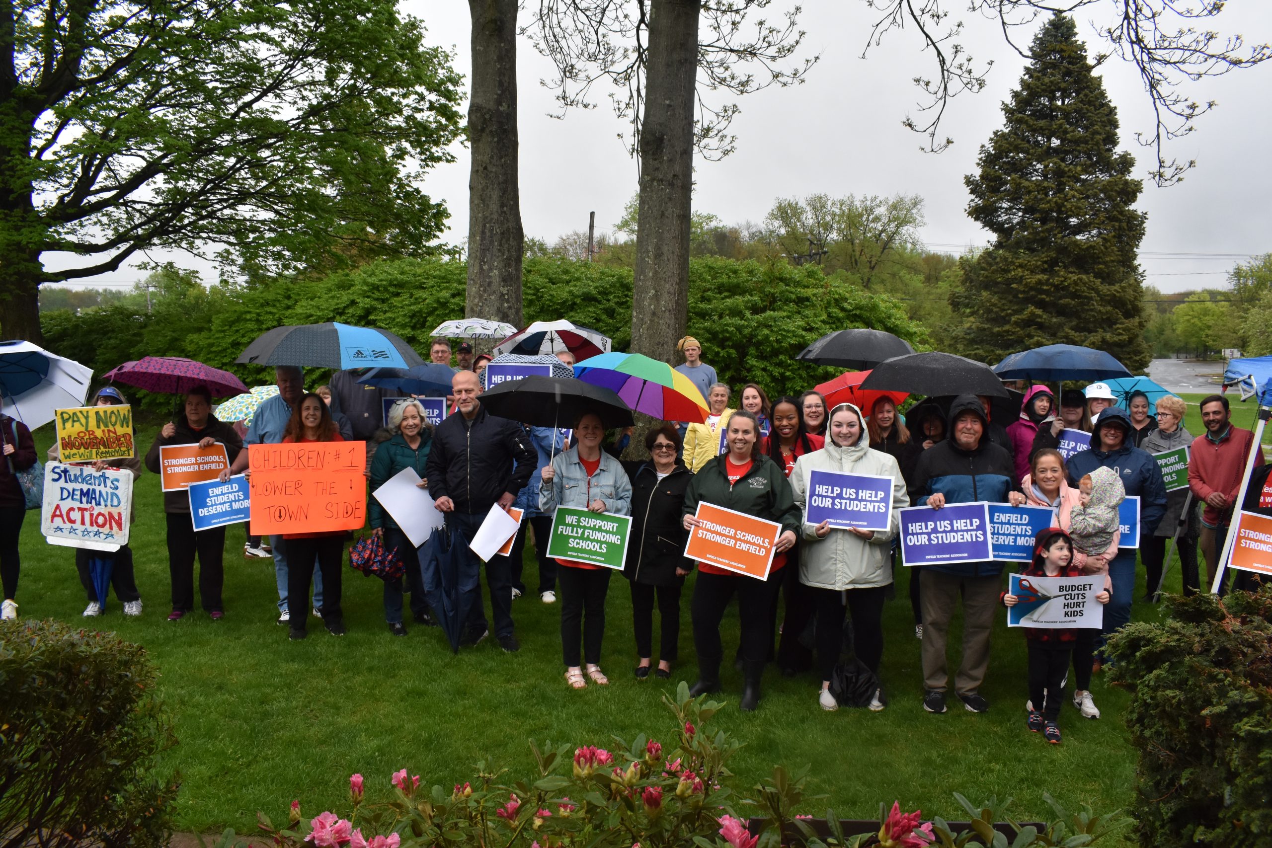 “We were seeing student growth, progress, improved student test scores, and better mental health before last year’s funding cuts,” said Enfield Teachers Association President Emily Hulevitch at Monday’s rally. “It wasn’t perfect, but we were meeting state averages and asking for more—and then the town decimated our schools. Now we’re trying to rebuild, and we need to start as soon as possible.”
